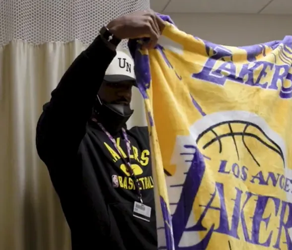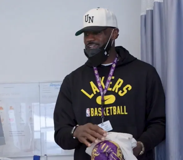 近日,詹姆斯现身加州大学洛杉矶分校健康中心,他亲切看望医院里面的病人,并向病人赠予礼物。